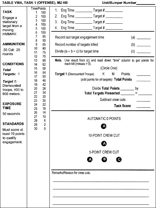 Table VIII is a marksmanship, single-vehicle qualification table. This table tests the crew's ability to zero a M2 HB caliber .50 machine gun, and employ direct fire to acquire and engage stationary and moving, area and point targets during various firing conditions. These tables are fired during the day and at night. This is not a tactical table; however, normal combat-oriented procedures, such as reporting, should be used. Some tasks are conducted in an NBC environment.