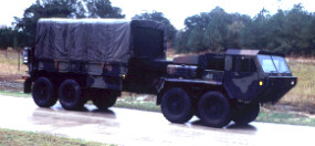 Background: The Marine Corps fielded the heavy tactical vehicle system during the mid 1980s. The Logistics Vehicle System (LVS) is a modular system consisting of a MK48 front power unit and, originally, four interchangeable rear body units (RBU). The front power unit and rear body units are joined by a hydraulically powered articulated joint that assists in steering the vehicle and allows a degree of independent movement between the front and rear units for more mobility. The articulated joint transfers automotive power to the RBU axles and hydraulic power for any hydraulically operated equipment. The completed units are 8x8 systems with two front steering axles. The LVS has an off road payload of 12.5 tons and an on road payload of 22.5 tons.