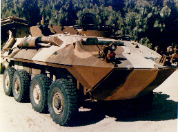 Features: The LAV-L is an all-terrain, all-weather vehicle with night capabilities. It is air transportable via C-130, C-141, C-5 and CH-53 E. When combat loaded there are 200 ready rounds and 800 stowed rounds of 7.62mm ammunition. There are 8 ready rounds and 8 stowed rounds of smoke grenades. The vehicle can be made fully amphibious within 3 minutes.