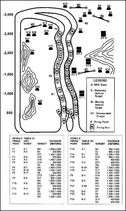 Table VIIIA will be fired during daylight and Table VIIIB should be fired at night. Using four and one mix ammunition, the crew will acquire and engage single and multiple, moving and stationary targets. Targets will be placed at ranges between 400 and 1,000 meters.