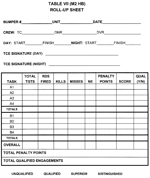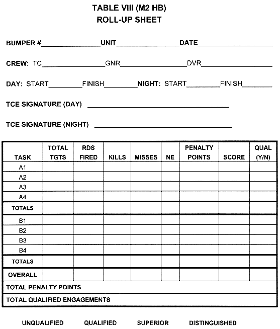 Table ____________________ Date________________ Vehicle Number______________ Gunner____________________________ Assistant Gunner_________________________ Tasks Scored GO: Table VIII A and B______________ Qualified/Unqualified_____________ Evaluator's Signature ___________________________ Tasks Scored GO _____________ |