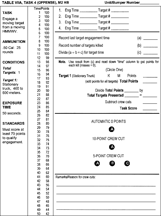 Tasks 1 through 4, Tables VIIA and B are scored using separate scoresheets. Refer to scoresheet scoring instructions. Within the allotted time per exercise, the gunner must obtain the minimum kills per target to pass each task. A crew duty penalty is subtracted for each crew error; there are three possible 5-point penalties, one 10-point penalty, and one automatic zero-point penalty. A maximum crew duty penalty point deduction of 30 points can be assessed per engagement. Additional crew errors will not be deducted, they will be critiqued.