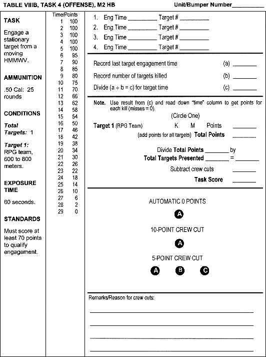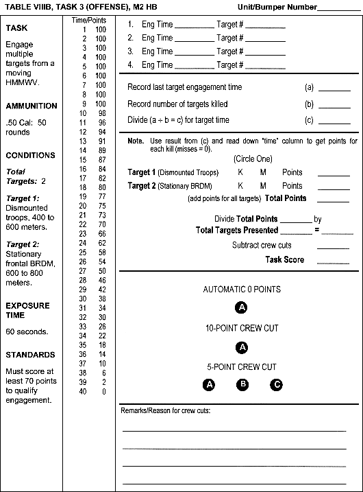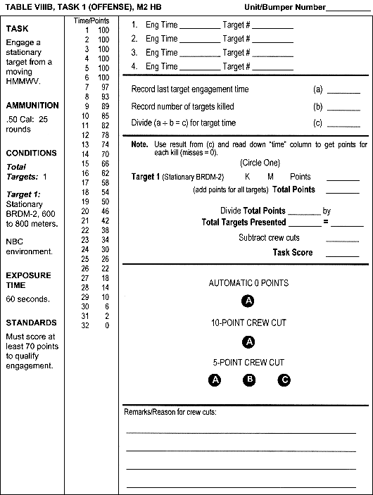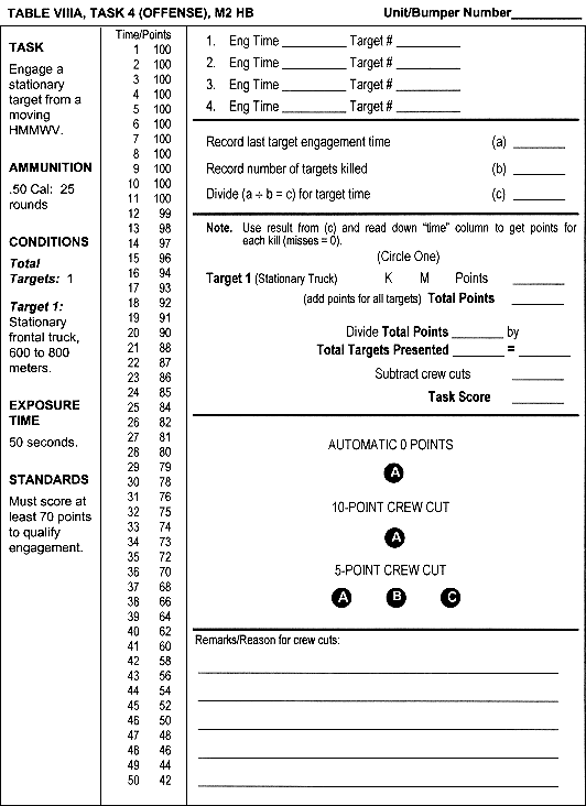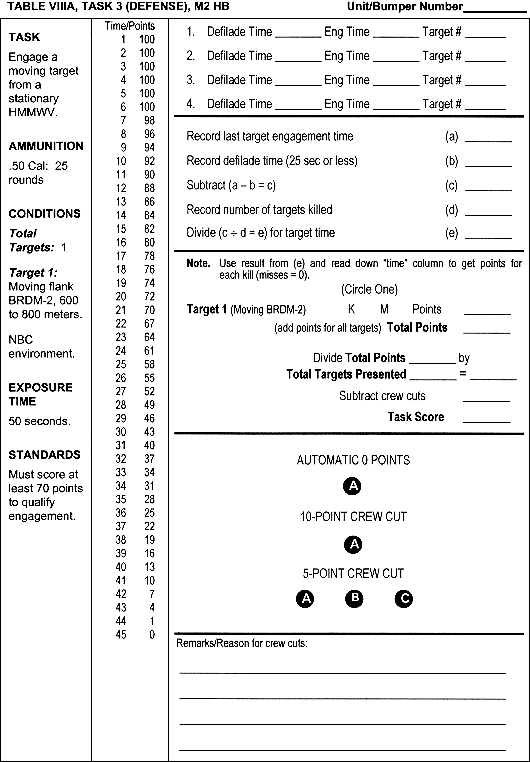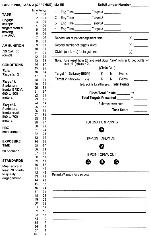 Table VIII is a marksmanship, single-vehicle qualification table. This table tests the crew's ability to zero a M2 HB caliber .50 machine gun, and employ direct fire to acquire and engage stationary and moving, area and point targets during various firing conditions. These tables are fired during the day and at night. This is not a tactical table; however, normal combat-oriented procedures, such as reporting, should be used. Some tasks are conducted in an NBC environment.