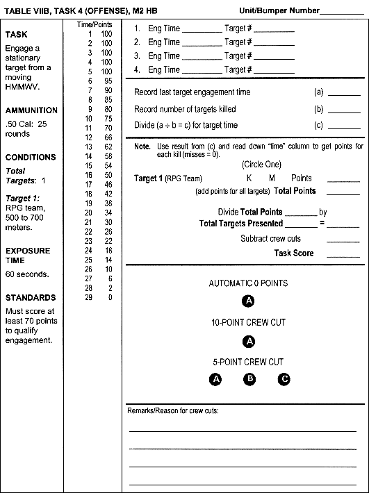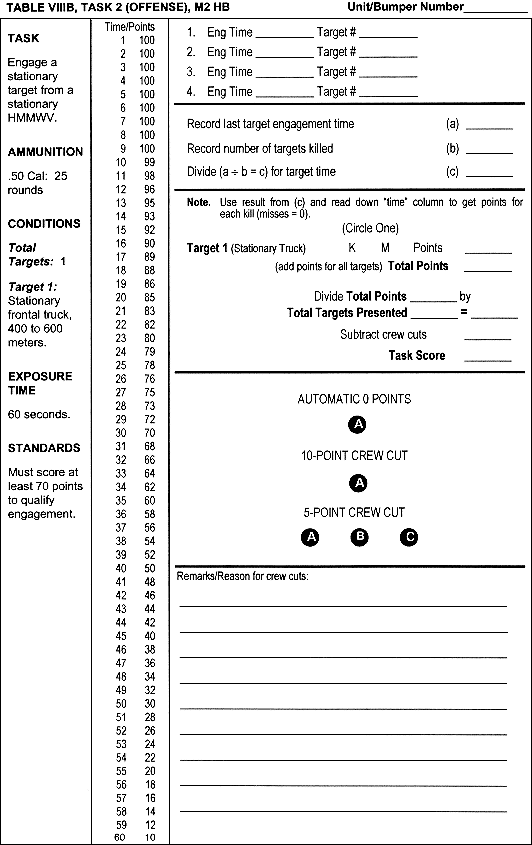 Task 1 of Table VI for the M2 HB and MK 19 is not scored. The remaining scored tasks for Tables VI and all tasks for Tables VII and VIII for the M2 HB and MK 19 have their own specific scoresheet; you must use the scoresheet for that specific task. The time/points column on the scoresheet for each task is based on the expected results of the engagements between the HMMWV, selected enemy targets, and the performance of the crew. The instructions below explain how to use the scoresheet for defensive and offensive tasks. Figure 12-1 and 12-2 show two examples of completed scoresheets for defensive tasks, and figure 12-3 shows an example of a completed scoresheet for an offensive task.