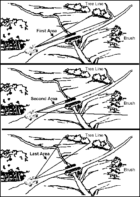 If no targets are found using the rapid-scan or slow-scan techniques, and time permits, crews should use the optics (day and night) to make a careful, deliberate, or more detailed search of specific areas in their assigned sector. This detailed-search technique is also used to search small areas or locations with likely or suspected avenues of approach (see Figure 3-3). To search using the detailed-search technique--