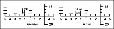 Table 4-1 shows the results of the computation for threat vehicles at various ranges. Determine the width of the target in mils. The range to the target is listed in the column below the mil measurement. Be sure to use the correct range, depending on whether the vehicle is viewed from the front or flank.