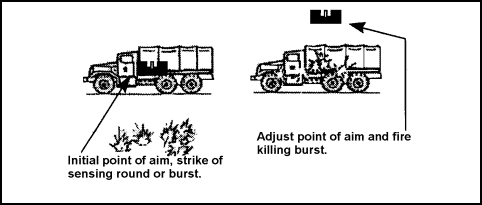 Engage moving targets using the BOT method of adjustment. The gunner fires the sensing burst, continuing to track the target and maintain the point of aim until he senses the rounds impacting. Once he has observed the strike of the sensing round, he makes his adjustment and fires a killing burst, maintaining his adjusted point of aim until the round impacts. He then continues to adjust and track the target until the target is destroyed.
