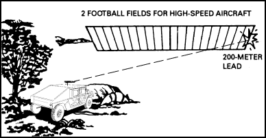 The football field method is used to engage fast-moving, low-altitude aircraft with all small caliber weapons (see Figure 6-6). The gunner aims approximately two football field lengths in front of the target and fires a long burst until the target leaves the effective range.