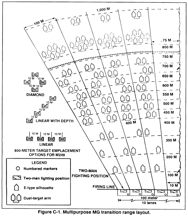 The standard, basic 10-meter range can accommodate a unit of 200 to 250 soldiers at a time; however, concurrent training may be required. This range (Figure C-2) can be used to zero the M249, M60, and M2 machine guns, and to fire the 10-meter portion of qualification. It is also used to familiarize soldiers with the characteristics, noise, and recoil of the weapon. This is the range used to practice target observation and adjustment of fire, to practice MG traversing and searching, to develop speed during operation, and to obtain an accurate burst.