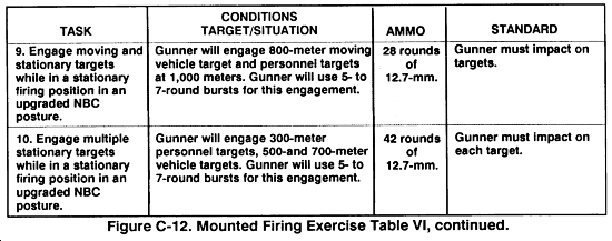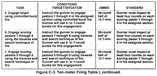 (a) The gunner will load one 154-round belt of ammunition and fire bursts of 5 to 7 rounds at double E-type silhouettes at ranges of 800, 400, 700, and 1,000 meters at vehicular targets. He will also engage multiple double E-type silhouettes targets at 400 to 700; 550 and 800; and 400, 550, and 1,000 meters respectively.