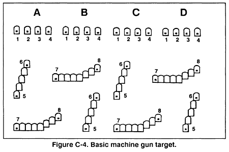 (b) Area targets. Area targets on the basic machine gun target are considered to be pasters 5 through 6 and 7 through 8 of section A, B, C, and D. Target group 5 through 6 exposes the gunner to T&E manipulation when using the tripod mount and body position changes to engage targets in depth (elbow position changes). This causes him to use a series of aiming points to disburse fire across the target when using the tripod. Target group 7 through 8 exposes the gunner to position changes to engage linear targets with depth. It causes him to control the burst length from the weapon, use a series of aiming points, and disburse fire across the target.