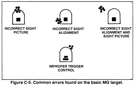 (2) Targets are analyzed and scored to determine the gunner's proficiency and to see if more training is needed in any of the fundamentals of M2 gunnery. During firing with a properly zeroed weapon, a target is best analyzed by considering the common errors of M2 gunnery (Figure C-5).