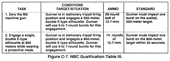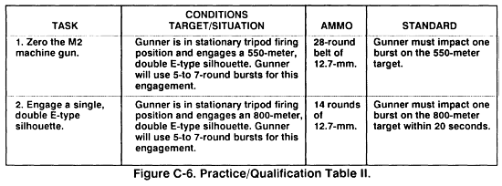 Qualification of the M2 consists of achieving the minimum standards for 10-meter, day, night, and NBC firing tables. One point is given for each round impacting in each space for Table I. For Tables II, III, and IV, one point is allowed for each target hit with an additional 2-point bonus when the target is hit with the first burst. The maximum possible for Table I is 119 points. A minimum of 12 points (12 out of 17 pasters) is required. The maximum score for Tables II, III, or IV is 33 points each. The minimum score of 23 must be obtained on Table II, III, and IV, which meets the standard for qualification.