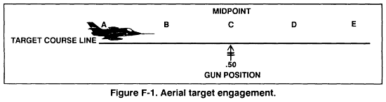 As an aerial target moves along its target course line, the lead required to engage the target changes because the range and angle between the aircraft and the gun position are changing. The lead required increases from the initial sighting (A in Figure F-1) to midpoint (B in Figure F-1). The required lead is at its maximum at midpoint.