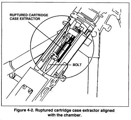 b. Removal of a Ruptured Cartridge. A ruptured (separated) cartridge case may be removed with a cleaning rod or ruptured cartridge extractor. When using the ruptured cartridge extractor, raise the cover and pull the bolt to the rear. Place the extractor in the T-slot of the bolt in the same manners as that of a cartridge, so that it is held in line with the bore by the ejector of the extractor assembly of the gun. With the extractor aligned with the bore and held firmly in the T-slot, let the bolt go forward into the ruptured case, and the shoulders will spring out in front of the case. Pull the bolt to the rear and remove the ruptured case and extractor (Figures 4-1 and 4-2).