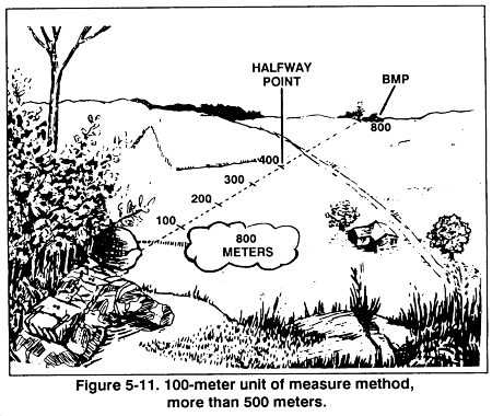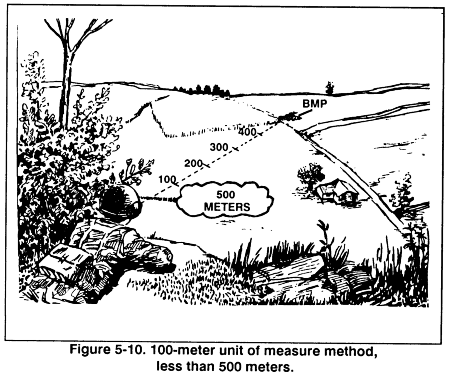 (1) When using the 100-meter unit of measure method, the gunner must be able to visualize what 100 meters looks like on the ground. With this distance in mind, the gunner can mentally determine the number of 100-meter units between his position and the target. The accuracy of this method is limited to 500 meters or less, and it requires constant practice (Figure 5-10).