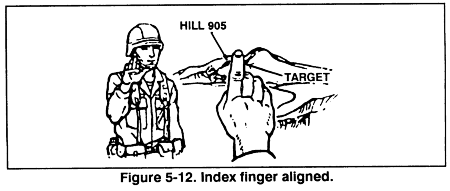 (b) The leader can designate a small or obscure target by pointing with his arm and hand or aiming the machine gun. When pointing with his arm and hand, a man standing behind him should be able to look over his shoulder and sight along his arm and index finger to locate the target. When a gun has been aimed at a target, a soldier looking through the sights should be able to see the target.