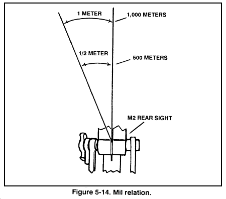 b. Adjustments on the target can be made using the mil relation; that is, one click of traversing or elevating handwheel moves the strike of the round one-half inch on the target at 10 meters. When firing on field targets, adjustment is made by moving the burst into the target. One click of traverse will move the strike of the round one-half meter at 500 meters, or one meter at 1,000 meters (Figure 5-14). However, the distance one click of elevation will move the strike of the round depends on the range to the target and the slope of the ground. The gunner determines the number of mils necessary to move the center of the strike into the target, and he manipulates the gun the required number of mils. This does not require the use of sights. For example, should the gunner fire on a target at 500 meters and observe the strike 10 meters to the right of the target and short about 50 meters, he would traverse the gun to the left 20 clicks (mils) and add one or more clicks (mils), depending on the slope.