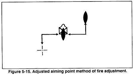 c. The gunner may use the adjusted aiming point method to adjust the fire. In this method, the gunner must use his sights. He selects an aiming point that will place the next burst on target. For example, when the gunner fires on a target at 500 meters and estimates that the rounds impacted 20 meters short and 10 meters to the right, he would rapidly select an aiming point about 20 meters beyond the target and 10 meters to the left of it and lay on that aiming point and fire (Figure 5-15).