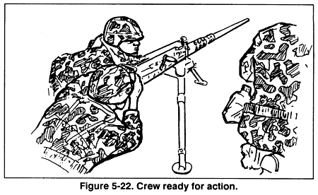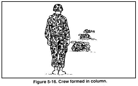 (1) Positions with equipment. The crew forms in column, facing the crew leader with five paces between men (Figure 5-16). They are in the following order: assistant gunner, gunner, and ammunition bearer. When the crew members reach their correct positions, they assume the prone position with equipment arranged as follows: