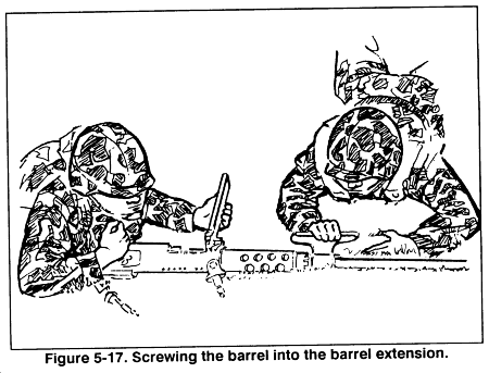 (4) When the ammunition bearer completes his inspection, he moves to the gunner's position with the barrel in his right hand and ammunition box in his left hand. With the aid of the gunner, he screws the barrel into the barrel extension (Figure 5-17). The headspace and timing adjustment is made. The ammunition bearer remains on the left and on line with the gunner.