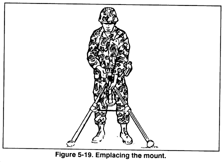 (1) At the command or signal ACTION, the assistant gunner grasps the left trail leg near the center with his left hand. Springing to his feet and grasping the tripod head with his right hand, he lifts the tripod across the front of his body with the front leg up, and carries the tripod to the desired location. Upon arrival at the position, he places the trail leg pointing upward. Steadying the tripod with his left hand on the front leg, he loosens the front leg clamp with his right hand (Figure 5-18), positions the front leg with his left hand, and tightens the front leg clamp with his right hand. With his right hand on the tripod head, he slides his left hand down on the left trail leg and with a snapping motion, pulls the left leg (to the left), engaging the sleeve latch (Figure 5-19). He then aligns the tripod for direction, drops the mount to the ground, stamps the right and left trail shoes with his right or left foot, and assumes the prone position behind the mount.