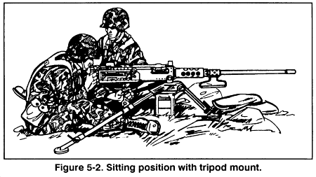 (2) The sitting position can be used when the tripod is set in a high or low position. The gunner sits directly behind the gun between the legs of the tripod. He may extend his legs under the tripod or cross them, depending on his physique. The gunner then places both elbows on the inside of his thighs to get the best support. He grasps the elevating handwheel of the T&E with the left hand, and lightly grasps the right spade grip with his right hand. He must ensure that the right thumb is in position to press the trigger (Figure 5-2).