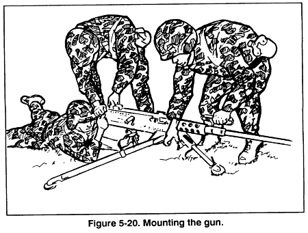 (2) The gunner and ammunition bearer move together. When the tripod is nearly mounted, the gunner and ammunition bearer spring to their feet. The gunner places both hands on the spade grips, the ammunition bearer grasp the ammunition box in his left hand and the gun carrying handle with this right hand. Both men lift the gun from the ground and move rapidly to the gun position. Then the ammunition bearer places the ammunition box on line and in front of the leader's ammunition box. The gunner, assisted by the ammunition bearer, inserts the pintle into the pintle bushing. The ammunition bearer stamps the front shoe into the ground with his left foot (Figure 5-20), releases the carrying handle, lowers his right hand, and lifts the gun pintle lock release cam. When the gun pintle is fully seated, he presses down the pintle lock release cam with his right hand, turns to his left, and returns to his original position.