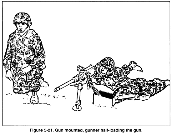 (4) With his right hand palm-up, the gunner grasps the retracting slide handle, vigorously jerks it to the rear, and releases it. The gun is half-loaded (Figure 5-21). He then assumes a prone position directly behind the gun with his legs spread and heels down. His right hand lightly grasps the right spade grip with the thumb in position to depress the trigger. His left hand is on the elevating handwheel (palm down) with his thumb near the traversing slide lock lever. He rests on his left elbow with his head as close as possible to the rear sight (Figure 5-22). He then gives the assistant gunner an UP. The assistant gunner announces UP and extends his hand and arm into the air in the direction of the leader.