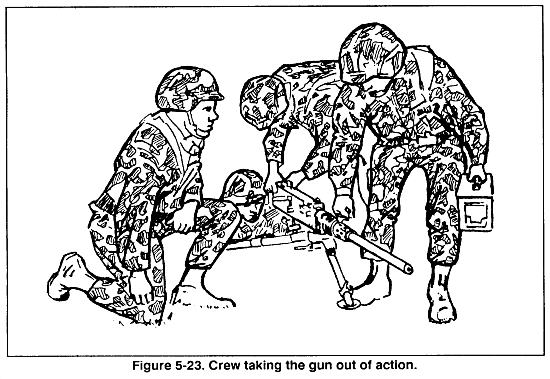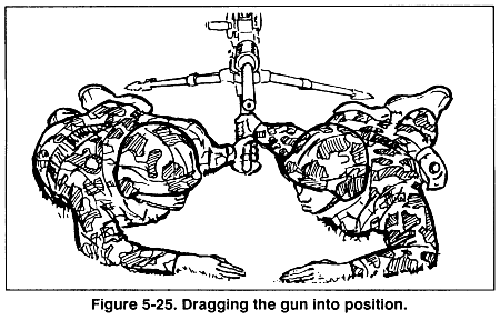 (1) Dragging. The gun is dragged when there is limited cover, or when the situation requires the gun to be moved in this manner. The gunner and assistant gunner drag the mounted gun to the desired position (Figure 5-25).