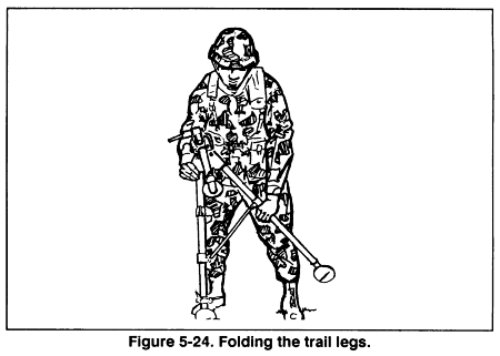 (4) The assistant gunner assumes a kneeling position behind the tripod and releases the sleeve lock latch with his right hand. He rises to his feet, grasps the front leg with his left hand, and rotates the tripod to a vertical position on the trail legs. With his right hand, he loosens the front leg clamp, folds down the front leg, then tightens the clamp. With his right hand on the tripod head, he rotates the tripod on the right trail leg and releases the sleeve latch. Then he folds the left trail leg against the right with his left hand (Figure 5-24). Holding the tripod head with his right hand, trail legs with his left, he lifts the tripod across the front of his body with the front leg up. He turns to the right and returns to his original position. At this time, the crew leader picks up his ammunition box and faces the crew. The assistant gunner places the tripod on the ground, assumes a prone position to the right of the tripod, and announces UP.