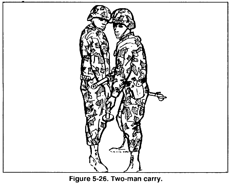 (2) Two-man carry. With the gunner on the right and assistant gunner on the left, each grasps the front leg with his forward hand and a trail leg with the other hand, just above the traversing bar (Figure 5-26).