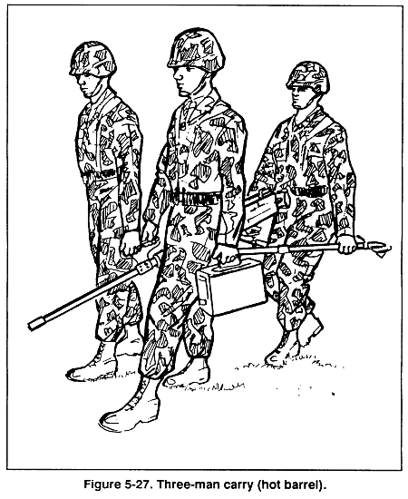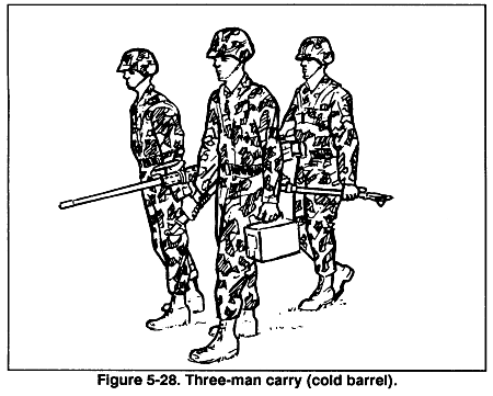 (3) Three-man carry. When the barrel is hot, the gunner gets behind the tripod with a trail leg in each hand. With the assistant gunner on the left and the ammunition bearer on the right, each grasps the carrying handle. In addition, the assistant gunner carries the ammunition in his left hand (Figure 5-27). When the barrel is cool, the ammunition bearer and the assistant gunner each grasp the front leg (Figure 5-28).