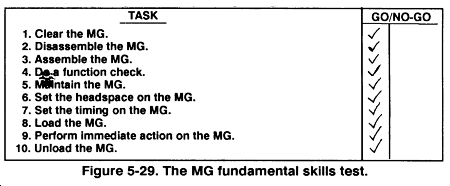 The machine gun fundamental skills test should be held periodically to ensure that proficiency with the MG is maintained by all crewmen. It consists of 10 fundamental skills; all tasks are hands-on (Figure 5-29). The test should be given prior to range firing on a go/no-go basis.