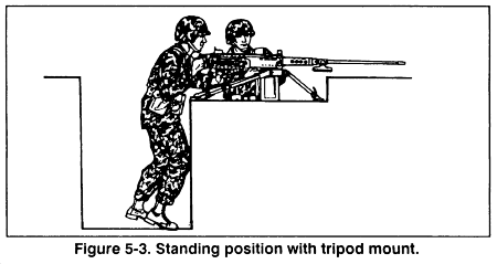 (3) The standing position is used when the gunner is firing from a fighting position. This position is assumed by standing directly behind the gun with the feet spread a comfortable distance apart. The gunner grasps the elevating handwheel of the T&E with the left hand. He lightly grasps the right spade grip with the right hand, ensuring that the right thumb is in a position to press the trigger. Adjustment of the body is allowed in order to align the firing eye with the sights on the weapon (Figure 5-3).