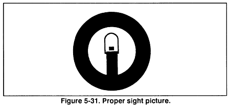 (3) Obtain proper sight picture. Obtain the proper sight picture by looking through the zero aperture and centering the front sight blade in it. Once the sight alignment is obtained, place this combination on the center base of the selected target (Figure 5-31).