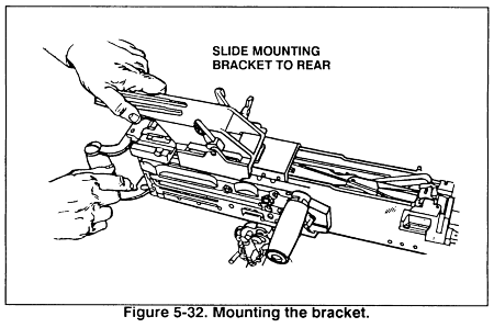 (1) Mount the mounting bracket. To mount the bracket, the gunner must ensure that the rear sight is in the down position. He then releases the catch on the left side of the top cover assembly and raises the cover to the upright position. He pushes the mounting bracket over the breech of the machine gun and slides the bracket rearward until it stops (Figure 5-32).