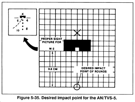 (3) Zero the AN/TVS-5. A gunner must zero the MG with its NVD on it before he can effectively engage targets with the AN/TVS-5. The zeroing of this device to the MG must be done at 50 meters. An M16A1, A2, or Canadian bull zero target may be used. The point of impact for either target must be 9.8 centimeters below the target aiming point. To accomplish this task, place the reticle aiming point on the target aiming point (Figure 5-35).