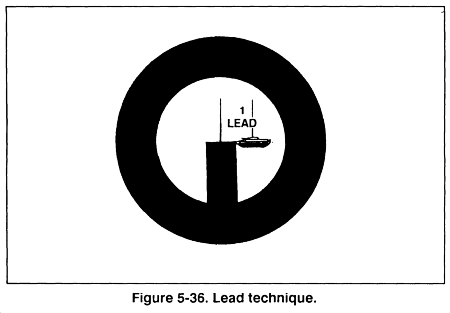 The gunner normally completes instruction in firing at stationary targets before he receives instruction in firing at moving targets. The technique of engaging a moving target differs from that of engaging a stationary target. The gun must be aimed ahead of the moving target a sufficient distance to cause the bullet and target to arrive at the aiming point at the same time. The distance is measured in target lengths. One target length as seen by the gunner is one lead. Leads are measured from the center of mass. The lead depends upon range, speed, and direction of movement of the target. To hit the target, the gunner aims at a point ahead of the target equal to the estimated number of leads, maintains the lead by tracking the target (manipulating the gun at the same angular speed as that of the target), and then fires. Fire is adjusted by observation of strike/tracer (Figure 5-36).