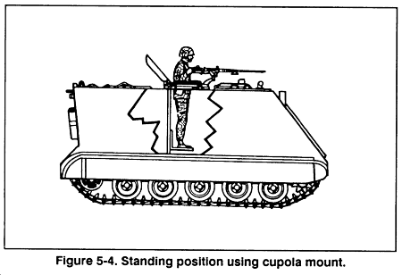 b. The vehicular firing position for the MG is standing. It is assumed by constructing a solid platform to stand on, using sandbags or ammunition boxes; or, in the case of the M113 APC, using the commander's seat. The gunner must then ensure that his platform is high enough to place the spade grips of the gun about chest high. He grasps the spade grips with both hands and places both thumbs in a position to press the trigger. The gunner holds the gun tightly to his chest for stabilization; his elbows should be locked tightly to his sides. He sights over the weapon and adjusts his position by flexing his knees and leaning forward to absorb any recoil (Figure 5-4).