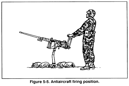 c. The antiaircraft firing position uses a standing position when firing from the M63 mount. To assume the position, the gunner stands with his feet spread comfortably apart with his shoulders squarely behind the gun (Figure 5-5). When the gunner is engaging aerial targets, he grasps the upper extension handles with both hands. When engaging low-level aircraft or ground targets, he grasps the lower extension handles with both hands.