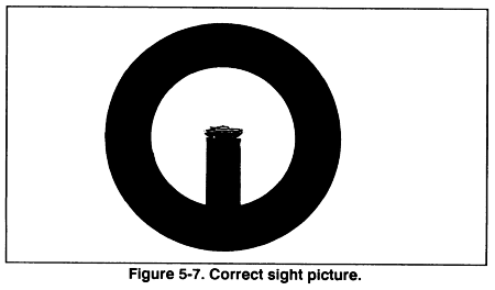 (3) The third step is to establish correct sight picture. To perform this task, the gunner adjusts the weapon until the top center of the front sight blade is bottom center of the intended target. Correct sight picture is a combination of sight alignment and placement of point of aim (Figure 5-7).