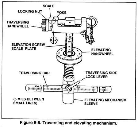 (3) The elevating handwheel is graduated in 1 mil increments from 0 to 50 mils and is fastened to the elevating screw by a screw lock. This synchronizes the handwheel graduations with those on the upper elevating screw. A spring-actuated index device produces a clicking sound when the handwheel is turned. Each click equals 1 mil change in elevation. The handwheel is turned clockwise to depress the barrel and counterclockwise to elevate.