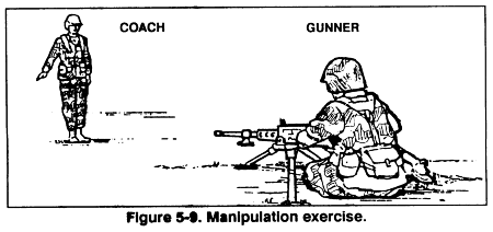 (5) The T&E manipulation exercise gives the gunner practice and the instructor a tool to evaluate the gunner's progress (Figure 5-9). The exercise is conducted in two stages. Both stages require the coach to give directions and the gunner to respond. In the first stage, the coach positions himself about 10 paces to the front of the gun. He then directs the gunner to manipulate the weapon in certain directions. He indicates the direction by the use of hand signals. The gunner responds by manipulating the T&E mechanism with his left hand. The gunner must keep his eyes on the coach; at no time during this exercise is he permitted to look at the T&E mechanism. The coach must be very attentive during the first stage because the gunner will be manipulating using the elevating handwheel and the traversing handwheel. The second stage is done in the same way except the gunner must make bold changes in elevation and deflection. The exercise continues until the instructor is satisfied that the gunner can manipulate the weapon by T&E without looking at the device. This exercise can also be conducted using the basic MG target. The gunner will be shifted from one selected target to another. The coach must observe all movements of the gunner during this training.