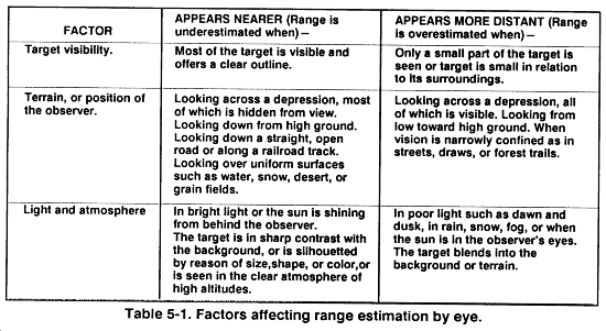 Range determination is the process of estimating the distance to a target from a gunner's position. The ability of the gunner to get the range to, sight on, and destroy a target is the realism of combat. Under combat conditions, ranges are seldom known in advance; therefore the effectiveness of fire depends largely upon the accuracy and speed of the gunner in determining range. Some methods of determining range are estimating by eye (Table 5-1), firing the gun, measuring range from a map or aerial photograph, stepping off the distance, or securing information from other units. Ranges are determined to the nearest 100 meters for machine gun firing. In combat, the most commonly used methods are estimating by eye and firing the gun. There is also a method used for measuring lateral distance.