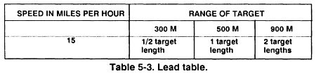 b. Leading. Mathematical computation or use of voluminous lead tables to obtain exact leads on a moving target are impractical in combat. The simple lead table shown in Table 5-3 gives the amount of lead necessary to hit a target moving at right angles (90 degrees) to direction to hit at speeds and ranges indicated.